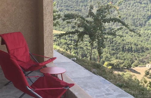 Picturesque village in the center of Corsica (10 min from Corte), built on a rocky outcrop. Panoramic views of the highest Corsican mountains, many possibilities for excursions. New studio, air-conditioned, fully equipped kitchen, washing machine, comfort mattress bed, private terrace and garden, TV international channels, WIFI. Apartment very bright, quiet and calm, Ground floor of villa.