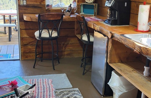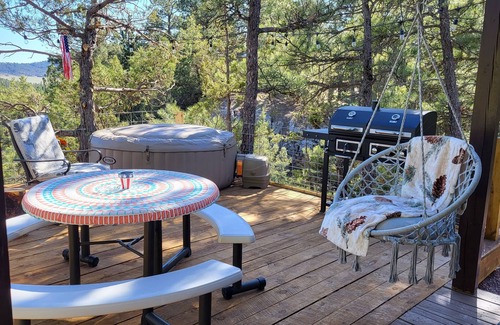 A beautiful hide-a-way in the trees, up high on a cliff edge with beautiful rock canyon views. Water is provided for showers (hot), dishes, etc. Check out evanscliff dot com for our properties... over 1000 5 star reviews, combined.