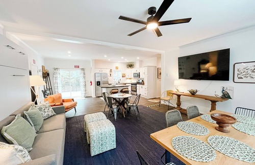 The living room on the Main Level has high ceilings with lots of natural light. It's outfitted with a 65" flat screen smart TV w/ HD and is connected to the dining room in an open concept that feeds into the kitchen. There are deep chairs and and 1 queen Murphy bed w/ integrated sofa for seating along with a farmhouse dining table that can each comfortably seat 8. On the Lower Level, there's another living area outfitted with a 55" flat screen smart TV and 1 queen Murphy bed w/ integrated sofa for seating and 2 regular queen Murphy beds (3 total Murphy beds in Lower Level).