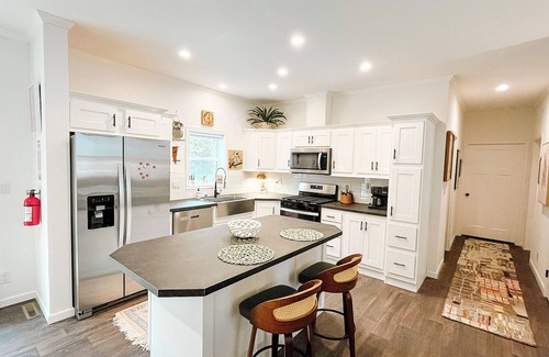 The kitchen on the Main Level is equipped with an island for cooking, refrigerator, microwave, stove/oven, and a dishwasher. It includes flatware, cooking utensils, pots and pans, glassware, and staple pantry items/spices/condiments. A coffee pot and Keurig are available as well as your basic small kitchen appliances. Kitchen island with countertop stools looks out to the backyard and a slider patio door to the furnished back deck makes it easy access to enjoy outdoor dining.