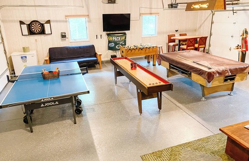 The attached heated finished garage (no cars allowed) is outfitted as a game room featuring ping pong table, pool table, shuffleboard, darts, foosball table, cornhole, card table/chairs, arcade games, ice chest, and 75" flat screen smart TV. Feel free to open up the garage door, use the grill, full use of the furnished back deck that's the length of the house, and fire pit with Adirondack chairs to toast s’mores!