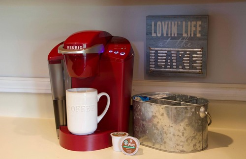 Fall asleep each night in the master bedroom’s luxurious king bed and wake up to a treetop view. There is a private entrance from the master bedroom to the deck overlooking the Lake. This bedroom adjoins a master bath with a tub/shower combination. A cozy second bedroom is conveniently outfitted with two single beds, and its own private bath with a shower. In the center of the condo is an open living, dining, and kitchen space with access to the amazing deck and bay views. The living area has a sleeper sofa and an ornamental fireplace. The open kitchen is well equipped and features a coffee bar to get you started with a morning cup of coffee, tea, or hot chocolate. The unit has 2 satellite TVs (one in the master bedroom and one in the living room) and free Wi-Fi internet access. The spacious deck offers ample seating for lounging and dining and a cozy porch swing. An electric grill is provided for outdoor dining experiences. (Charcoal and gas grills are prohibited). A clothes washer and dryer are available for your convenience.