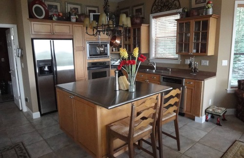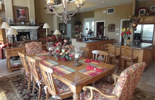 The interior of the home is professionally designed and decorated and captures a casual yet classic mountain lodge feel. A dramatic 2 story Great Room with grande stone natural gas fireplace (with remote) is the focal point of the first floor and is furnished with a leather sofa & love seat, & club chair. 2 Large 8FT high x 12 FT wide glass sliding doors open on to the deck with a magnificent view The first floor open plan also features a pine dining table seating 8, A cozy bay window seating area with two lounge chairs and ottoman. The well appointed gourmet kitchen and pantry (stocked with the basic spices and essentials)has a large stainless steel island and two counter height bar stools. All appliances are stainless steel. The refrigerator has ice and water in the door .There is also a bar height counter with three stools. A powder room is also located on the main level. There is a laundry room with washer , dryer, and stainless steel laundry sink. There is a large dog crate in the laundry room. . Access to the Hots Springs Spa is through the laundry room. Put your towels in the dryer when you go in the spa and when you come out they will be nice and warm!