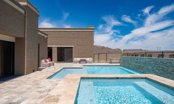 This opulent short-term rental home in Parker, Arizona, with four roomy bedrooms and four contemporary bathrooms, promises an unforgettable stay with its breathtaking views of the surrounding natural beauty, complementing a private hot tub for relaxation, a refreshing pool perfect for a dip on warm days, and a well-equipped BBQ area for delightful outdoor dining experiences. and only 1 minute from the world-famous Roadrunner floating bar and resort.