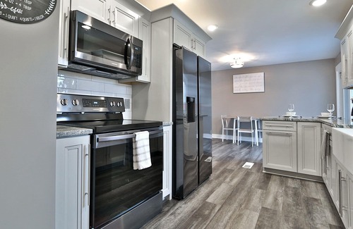 Kitchen has all granite counter tops, new black stainless steel appliances, and plenty of amenities to be able to eat in if you so desire.