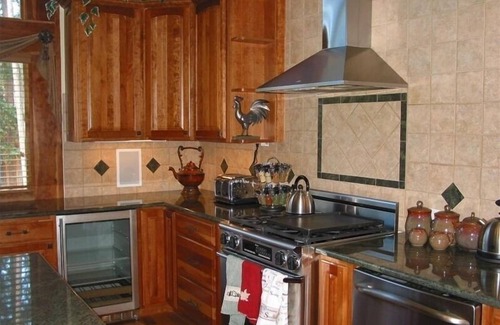 Kitchen with stainless appliances, granite counter tops and high end kitchen accessories where any gourmet chef will feel at home. Seating for four at kitchen island. Relax on two oversized couches in front of a gas burning fireplace with a new 48 inch flat screen TV above it.