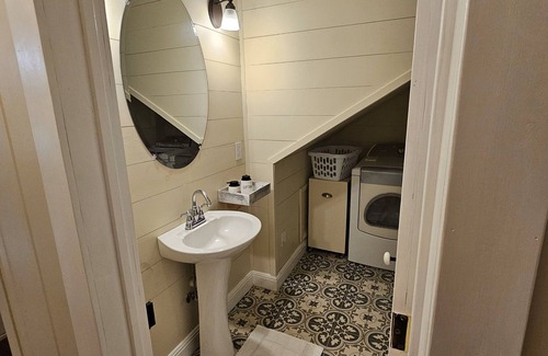 It's a step back in time but, with modern conveniences. With 2 full beds upstairs and a queen bed downstairs, it will accommodate up to 6 adult guests and you will have the entire home to yourself. It also offers a fully equipped kitchen, a parlor, an office area, a full bath with a laundry area on the first floor and another full bath upstairs, both with showers.