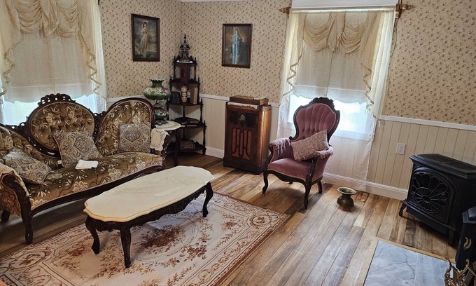 The house is believed to have been built sometime in the early1880's originally constructed with hand-hewn beams for the foundation, square nails and rough-sawn lumber. After a 3-year plus restoration of the home, much of the original structure was left intact. The house features original style mill work and siding, original window frames with the "wavy" window glass, original gable-end architecture, replicated and original window trims, a metal roof, half-round guttering, the original hand-made, hand-planed kitchen door with its square nails, locally milled hard-maple flooring and other time-appropriate features along with some curious construction anomalies left as originally constructed. It's furnished with early 1900's and vintage furniture and Victorian replicas including a 1930's working radio and a Sears phonograph, a 1924 farmhouse sink, Gone with the Wind lamps, antique fireplace mantle and decorative summer covers over the closed fireplaces. As a neighbor said, "It's like coming home".