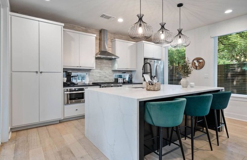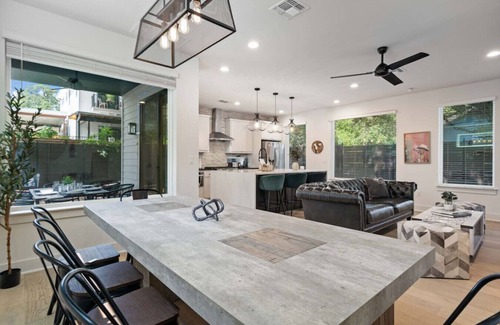 Modern 4-bedroom, 3.5-bath home in East Austin, perfect for groups of up to 9. Enjoy stylish interiors, open living spaces, and a fully equipped kitchen. The private yard offers fun outdoor games, ideal for relaxing or entertaining. Located just minutes from downtown, with fast Wi-Fi, smart TVs, and walkable access to top dining, music, and nightlife. A perfect stay for families, friends, or work trips.
