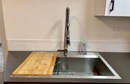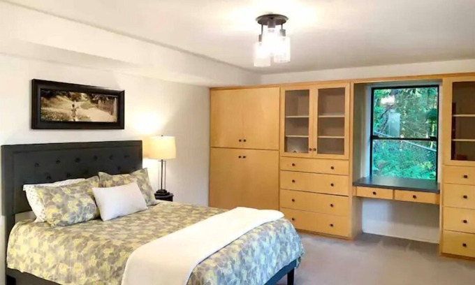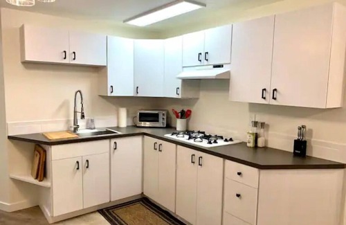 The apartment has a spacious primary bedroom, a full bathroom with a laundry and a kitchen/dining room/living area. Complete with a fold-out sofa, Wi-Fi, TV and work station area. This fresh space as plenty of parking in a private entrance.