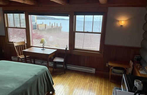 Cozy beachside studio overlooking Lake Superior sits right on the beach. Simple and charming room with log beams, wood floors and big views. Queen size bed looks out at the sun and moon rises, vanity, private bath with shower and toilet. There's a small refrigerator, microwave and coffee maker. Located right downtown Grand Marais, you can walk to all the restaurants for meals. Enjoy a beach fire in the evenings, or stream a movie on the free wi-fi. Basic accommodations, but you'll love the quaint charm and unparalleled location.