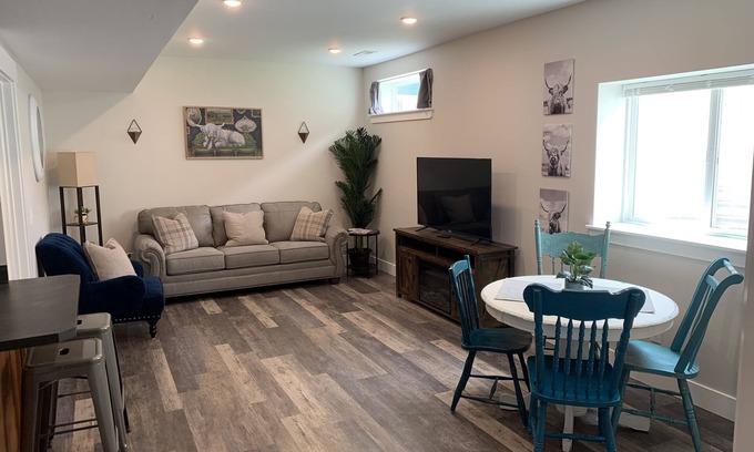 The living space offers 1,142 square feet, tons of natural light, and 9-foot ceilings in this daylight basement of a new home constructed in 2021. All new and freshly furnished in June 2022. The house is located on a private street with just us and one other home, so it's great for kids to play outside or adults to enjoy some quiet space. (The neighbors are very quiet.) The layout features an open-concept kitchen and living room, 2 bedrooms with new pillow-top mattresses (1 king and 1 queen), 1 bathroom with a big soaking tub/shower, and your own private clothes washer and dryer. Bedroom 1 has a king-sized cooling technology pillow-top mattress, a large closet and dresser, great natural light, nightstands, and bedside lamps with USB plug-ins. Bedroom 2 has a queen-sized pillow-top mattress, closet and dresser, nightstands, bedside lamps with USB plug-ins, and two large windows for great natural light. A new queen sofa sleeper in the living room brings the total bed count to 3 beds, or 6 people. A pack & play with bassinet and changing table insert is available for your little one. Central AC and heat keep the space comfortable year-round. To accommodate sleepers of different temperature comfort levels; there is an electric fireplace with thermostat in the main living / dining / kitchen, and electric heaters in each bedroom to get each space just the right temperature. The full kitchen has everything you need to get cooking; new stainless appliances, pots & pans, dishes, cups/glasses, cooking utensils, and silverware. The bungalow is thoroughly cleaned and sanitized between every guest booking by a local professional cleaning company.