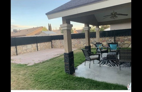 This is a 2 story, 3 bedroom, 3 bathroom home in a nice quite neighborhood in east El Paso. Includes an upstairs loft with futon couch, spacious back yard and 2 car garage with remote for guests and extra parking space in front of home. The large couch in living room is also a pull out bed. Home also includes washer/dryer, up to date kitchen appliances with kurig coffee machine with coffee for all guests. House will provide fast Wi-Fi with cable service on all tvs and apps for personal sign in options. Big 8K 70” smart tv in living room and 65’ in master bedroom.