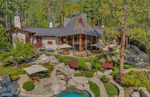 The garage features six separate bays, including a mechanical systems area, refrigerator and a half bath, while the property boasts a whole-house generator, sprinkler system, and water intake from Lake Tahoe. A smart home system is incorporated within the estate. Lastly, the 16-inch concrete insulated walls, radiant heated stone floors, native granite aggregate, a "Totem Wet Bar" and wall hung bookcases and shelves of teak and glass, custom cabinetry in Western Red Cedar with special detailing, back lit wall hangings, etched designs in lighted mirrors, and hand hewn logs are just a few of the finer points that will carry the spirit of the house for generations to come.
