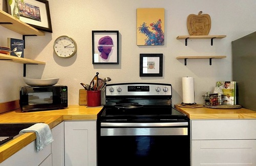 As you step into "East Austin Oasis," you'll be greeted by a burst of color and creativity. Perfect for gathering and chilling, the open kitchen living are full of art and comfy seating.