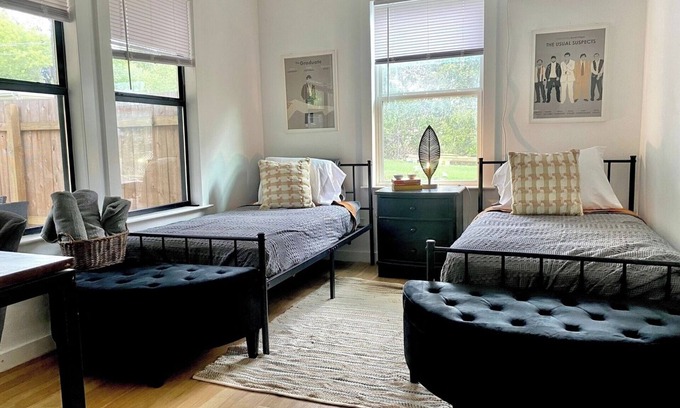 A cozy queen-sized bed with soft linens will ensure a restful night's sleep. The front room with two twin beds has a desk for working at home.