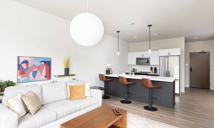 This one bedroom home features a full kitchen with bar seating, spacious living room, walk-in closets, in-unit laundry, and a private balcony. The space comfortably sleeps two with a queen bed plus flexible seating areas so you can work or relax at your convenience. The sofa may serve as additional sleeping space, however please note it does not have a pull-out bed. Building amenities include a resident lounge and game room, 24-hour fitness center with Peloton bikes and yoga studio, conference room, outdoor grill and lounge, and Tide dry cleaning lockers.