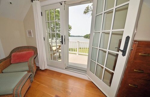 The master bedroom on the second floor is a serene retreat and has a queen bed and vintage wicker reading chair and ottoman. The french doors open onto a large balcony overlooking the cove with a cedar double bench, perfect for enjoying your morning cup of coffee or tea. This suite has two full sized dressers and two closets for your use. The en suite master bathroom features heated tile floors, a claw foot tub lit by antique sconces as well as a separate tiled shower.