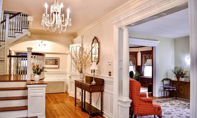 This enchanting house boasts an array of amenities designed to enhance your stay. You can enjoy the cozy library alcove for quiet moments, while the well-stocked kitchen makes preparing meals and entertaining effortless. The spacious third floor features additional bedrooms and a bath, accommodating your bridal party or family with comfort. If you're hosting a larger event, you can easily add extra rooms for a modest fee or book the entire three-floor house through the listing for George T. Greenhalgh House, ensuring ample space for everyone.