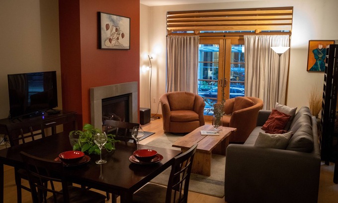 Elegant: Comfortable, open floor plan, 757 sq. feet. Gas fireplace and floor-to ceiling windows. Fully equipped kitchen with gas range. Queen Sleep Number bed, plus fold-out sofa bed. Large bathroom. Washer and dryer in the unit.