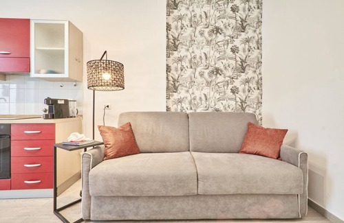 The apartment consists of a lovely living room with an open kitchen, perfectly functional, equipped with TV and a large dining table. The space is easily transformed into a comfortable sleeping area, as it is equipped with a double sofa bed, perfect for enjoying wonderful moments of tranquility. The sleeping area is equipped with a double bedroom, quiet and intimate. The apartment benefits from all the necessary amenities to ensure a wonderful stay in the heart of the city.