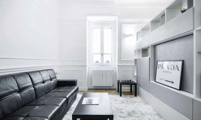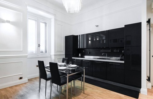 This recently renovated apartment combines elegance and modernity, presenting a perfect synergy between the classic artistic stuccos on the ceiling and the elegant parquet that adorns each room. The entrance welcomes you with a designer kitchen, where glossy black lacquered furniture blends with cutting-edge appliances, reflecting a timeless contemporary style. The kitchen opens towards a bright dining area, separated from the living area by a multifunctional wall that incorporates a swivel smart TV, allowing for fluid use of multimedia content from both spaces. The living room is embellished with a sophisticated and welcoming sofa bed, optimized for daily comfort and ideal for hosting visitors. Completing the interior is a luxurious bathroom with an inviting bathtub, perfect for moments of relaxation. The entire apartment is whitewashed in a black and white palette, giving a chic and cohesive atmosphere that accentuates the harmony between tradition and innovation.