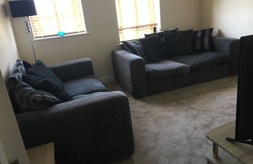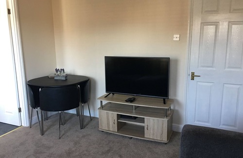 This wonderful top-floor apartment has a view of Eaton Ford Green. The Riverside Park and the St. Neots Town Center are both only a short distance away on foot. The main bedroom includes a double bed, nightstands, and a sizable built-in mirrored closet. A double bed, bedside cabinets, and a closet are in the second bedroom. A sofa and armchair along with a table and chairs for four people make up the main living/dining room. The lounge includes a large smart TV with a 100Mbps fibre connection from Virgin Media.