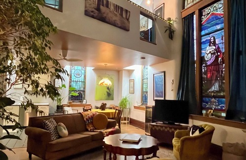Enter through the big green front door of the church into the original vestibule, which opens to a spacious great room with massive ceilings. Here you'll find a cozy seating area, surrounded by large plants (including "Figgy" a 9ft ficus!), an old record player, a TV ready to stream your favorite shows, and lots of eclectic art, books, and trinkets to explore.