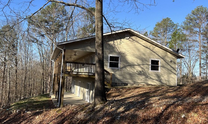 Hill side cabin with great views. Perfect for the Eclipse. Just up the hill from a 10 acre field that would be perfect for full views of totality. Two story. 4 bed room. Three bath. Very clean rental. Full kitchen. Covered porch out front.