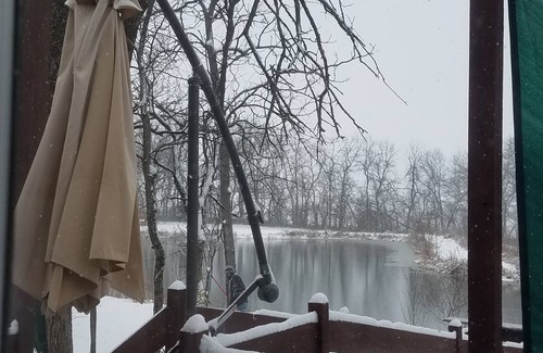 Cabin is 1 story, with ramp to get in the house (made for owner needs) at front deck, 36" door main entrance, 3 bedroom with double bed and futon each room and private bathrooms, all 4 bathrooms with neat granite or glass tops, estate of the art commercial appliances VIKING kitchen, 4 gas burners, 4 electric burners, gas oven, microwave, stainless refrigerator, warmer drawer, beautiful walnut finish cabinets and granite tops, breakfast nook and bar counter seat 8 and heart room with TV and poker pad, formal dining room seat 8, and formal living room, very eclectic décor and architecture, sliding barn doors and French doors throughout the cabin, furniture are practical and modern, designed by owner Iveth Jalinksy, enjoy the pond, fish, enjoy the fire pit, house has 3 patios with tons of seating, outdoor dining room, 3 decks and 1 dock with chaise lounges for sunbathing.