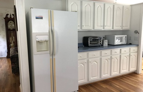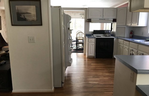 This entire home is available for your vacation in Western North Carolina. The open floor plan unites the large living room, formal dining room, kitchen, breakfast nook and den (which has a trundle day bed available for up to 2 children at additional charge of $20.00 per child per day). The kitchen is fully stocked with cookware, implements, dishes, dishwasher, stove and oven, full refrigerator, a microwave, toaster oven, toaster, and regular coffee maker.
