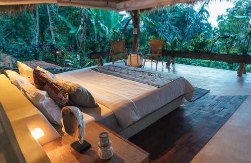 1 bed room natural open hut with an open air wall-less jungle suite nestled in the arms of nature, completed with a king size bed and open bathroom that comes with a copper bathtub, shower area, hot and cold water, overlooking the beautiful greenery and panoramic view.