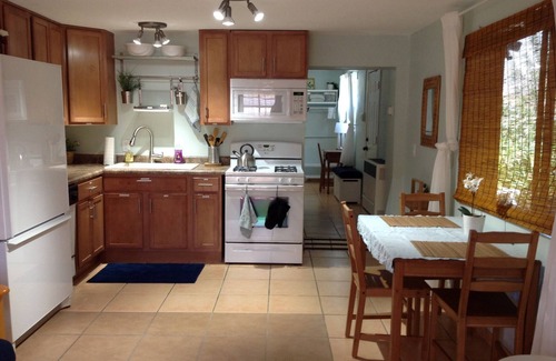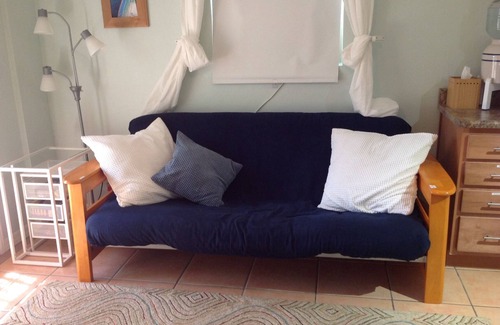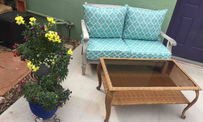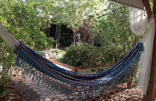 Hello, we love our home and hope you do to! We do our best to create a comfortable space inside and out. We have designed our home and lifestyle to be earth-friendly and appreciate any effort that you wish to partake in it too. For our guests we supply the house with natural soaps and cleaning products, have a grey water washing machine as well as outdoor shower and bath, have recycling, and invite you to add to our compost bin. We also have 5 sweet chickens in a coop. If this sounds wonderful to you then please read more details about our space below! The guest house is around 600 sqft.; it is quite spread out and feels bigger than that. There is a living room, kitchen, bathroom and bedroom with a desk. We have a Keurig coffee machine, a coffee press, and tea available. There is a full size kitchen (stove, oven, microwave), fridge/freezer, and even a small dishwasher (brand new). The bedroom has a comfortable Tempurpedic queen bed, and a second sleeping space is a large futon in the living room. The two sleeping spaces are seperated by a hallway, kitchen, and bathroom. There is no door on the bedroom, but we do have a curtain for privacy. There is an ironing board and a blow dryer. The washing machine and dryer (also a clothes line) are outside. There is a flatscreen tv with a built in DVD player in the living room (no tv in the bedroom). You have your own private patio in front of the guest house. It includes a round table with chairs and shade, a bbq, and string lighting at night. This area has just been added, so we hope you still enjoy the space while we add a few more sweet touches to it. The backyard is a shared space. It’s our little oasis in the middle of the desert. We have fruit trees and a small garden with veggies and herbs, so please help yourself to what intrigues you. The backyard is a shared space with the main house, which we also rent out. We have two 1,000 gallon water harvesting tanks, a garden/small orchard, a compost, and a grey water washing machine. There is also an outdoor shower and bath (you can bathe under the stars!!!). If that isn't relaxing enough for you then you can sway in a hammock or do yoga on the (fake) grass under the trees. There is a private gazebo in the corner for reading, sipping a comforting beverage, or at night you can turn on the gas fire pit or grill on the bbq.