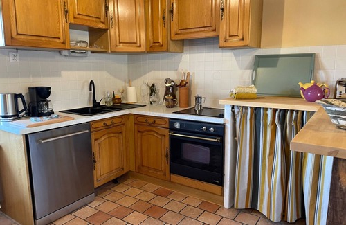 Mandatory cleaning fee (additional charge): €80. The house is on two levels and is accessible via an outdoor staircase. The front door opens onto a 35 m² living room, whose two windows overlook the village and the hills of the Alpes Mancelles. The welcoming and understated decor includes a natural coconut rug, mirrors, antique photos, and several lamps. On the right, a few steps lead to the 30m² kitchen, which also serves as a living room equipped with a fireplace, a cherry wood table (8 seats), a refrigerator, a sideboard, and a blackboard.