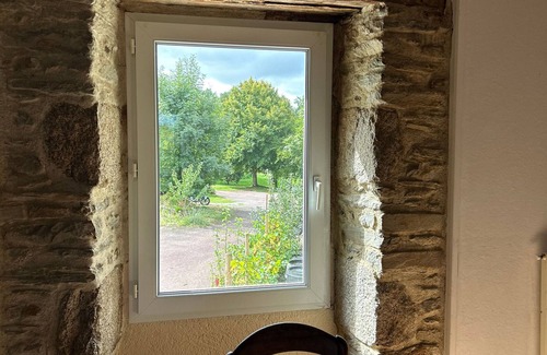 Access via a staircase to the first level of the gîte: a large separate living room with a sofa bed and TV. A bathroom with a sink and walk-in shower, and a toilet. A large fully equipped kitchen and a dining area with an insert fireplace. Stairs lead to the second level, offering three bedrooms. Each bedroom is equipped with two single beds that can be combined to form a queen-size bed. There is a full bathroom and a toilet/sink. Landing with a sofa that can be used as a bed for one person. Access to the cottage is via a private path and a private outdoor area, including a picnic table and umbrellas, deckchairs, and a charcoal BBQ. Beds are made upon arrival and heating is included.
