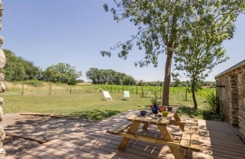 In the peaceful countryside, 35 km from Angers and 5 km from the Loire River, this detached barn, located near the owners' house, has been renovated with respect for its heritage and the environment (Ecogîte label). It features a 300 m² private enclosed garden with a south-facing terrace and a vast natural area surrounding the gîte. Salt-water swimming pool heated from mid-May to mid-September (shared with the owners, dimensions 10x5m).