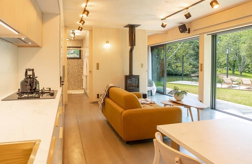 Whether relaxing on your sofa, on your private terrace or in your Nordic bath, you can admire the surrounding nature while being lulled by the song of birds, the whisper of the wind in the trees and the gentle sound of a small stream nearby. In addition, thanks to the total absence of light pollution, you can spend enchanting evenings gazing at the stars while enjoying a soothing midnight bath.