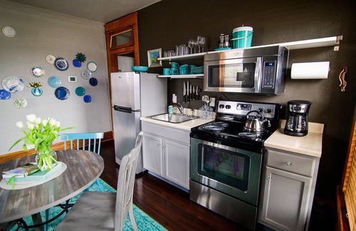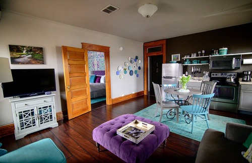 FLAT #4, Eddy - Lafayette Flats Boutique Vacation Rentals is four modern vacation rentals in one historic building. This listing is for Flat #4, Eddy which is found on the third floor. Walk up the 42 stairs through the airy art-filled stairwell to reach your beautiful flat (please note: there is no elevator in this historic building). Eddy is designed to luxuriously accommodate two adults, as are all four vacation rentals at Lafayette Flats.