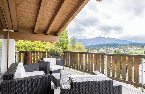 The living room offers a cosy retreat, equipped with a TV, an intelligent Alexa control for convenient operation and a warming fireplace that creates a great atmosphere for spending time together. From the dining area, you can access the terrace, which is furnished with lounge furniture. The view over Flims and the Surselva mountains invites you to spend cosy evenings, especially in summer.