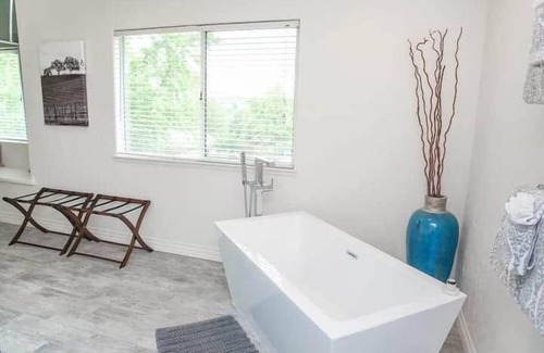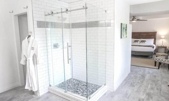 Welcome to our stunning second-story master suite, where luxury meets tranquility! Featuring a sumptuous king-size bed, this suite is designed for your ultimate relaxation. Unwind in the oversized shower or indulge in the deep soaking tub for two, creating the perfect oasis for rejuvenation. Two charming window seats offer picturesque views of a quaint orchard and lush garden, immersing you in the beauty of country living. Enjoy top-notch amenities, including a flat-screen TV for entertainment, a plush deluxe mattress for a restful night’s sleep, and a convenient refrigerator for your favorite snacks. Wrap yourself in cozy robes, wake up with our sunshine alarm clock, and enjoy a gentle breeze from the ceiling fan. Escape to this serene retreat and experience the perfect blend of comfort and elegance—book your stay today!