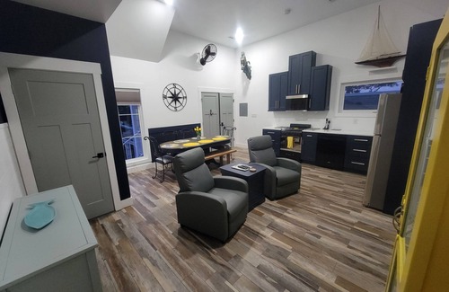 This 640 sq. ft. apartment boasts a private entrance and is a newly appointed getaway. The kitchen offers a scenic view of the Albemarle Sound, complemented by dramatic ceilings and coastal-themed furnishings and decor.