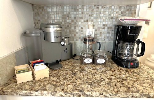 - Coffee bar with drip coffee maker, French Press, hot water kettle, regular and decaf coffee and an assortment of teas