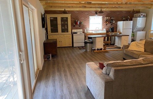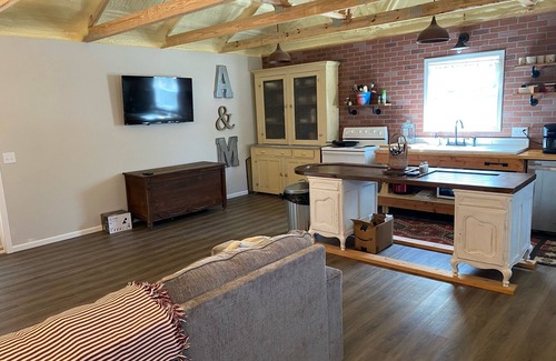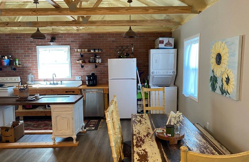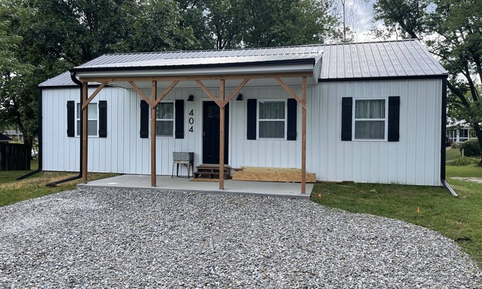 Sit in the large backyard and play corn hole while discussing the days events. This 900 square foot cabin in the heart of Edina Missouri has two full bedrooms, 1 full bathroom and open concept living, kitchen and dining in one space. Two queen sofa beds in living room and large table with 4 chairs and a large bench for dining. Stove, micowave, dishwasher, refrigerator and washer dryer. Most household utensils available. Let us know if we have forgotten something that we can consider adding.