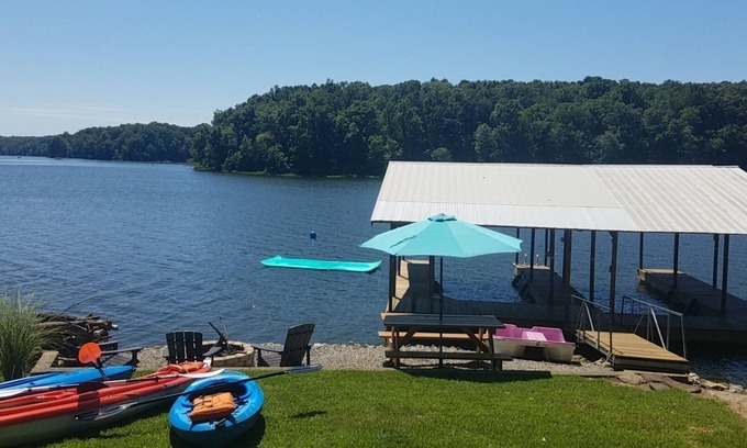 BEST LOCATION on Lake of Egypt, right across from Party Cove and just a short kayak ride away from Egyptian Hills Resort. Beautiful view close to all the fun. You will love our cozy cottage with its own private double covered dock on deep water. We provide a large floating lily Pad for more swimming fun. In the evenings, enjoy the fire pit down by the water. Lake of Egypt is great for fishing, swimming, or boating. Don’t have a boat, don’t worry, we provide 3 kayaks, a petal boat, and a paddle board so you’re all set to go. *High Speed Internet