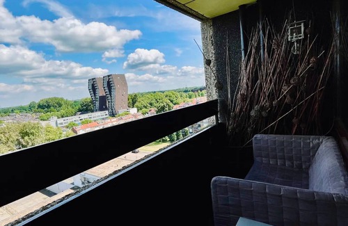 An atmospheric 55-square meters apartment, located on the 9th floor, on the north side of a traditional 1977s building in Eindhoven. Within a 300-meter radius there are more than hundred free parking spaces, several stores, fast food bars and two bus stops. The train station and the city center are about a 25-30 minutes walking distance, 15 minutes by bus and 12 minutes by bike.
