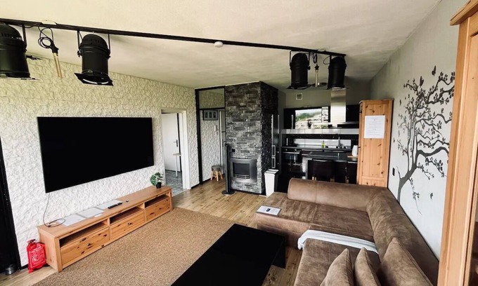 - a living room with comfortable corner sofa, beautiful sky view and 75-inch smart TV,