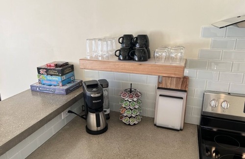 Unit consists of 4 rooms, 2 bedrooms, bath, and a large kitchen/living area. Approximately 900 square feet worth of space to spread out and make yourselves comfortable. Kitchen is equipped with all the pots and pans you may need, along with full size stove, refrigerator and dishwasher, to prepare a nice meal for friends and family and quickly clean up. Bathroom has ample room for a pair to get ready with dual sinks, as well as in suite washer/dryer for those longer stays.