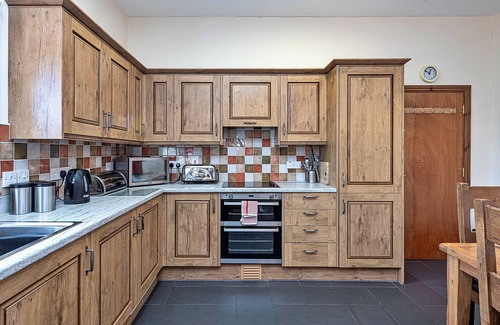 As you step into the cottage, you will be greeted by country-style oak furniture that sets the tone for your stay. The kitchen is adorned with slate-tiled flooring and features a dining table and six chairs, as well as modern conveniences such as a fridge-freezer, cooker, microwave, dishwasher, washing machine, and tumble dryer. The living room is furnished with a 3-piece suite for 6, coffee tables, Freeview TV, and a complimentary wood-burning stove. The hallway leads to a charming outdoor haven complete with a table for 6.