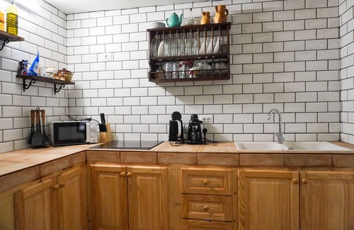 We access the house through its spacious living-dining room, where you can enjoy the warmth of its fireplace while enjoying its long and comfortable sofa watching a movie or playing one of the board games available in the house. After the living room, you will find on the left hand side the fully equipped kitchen and the washing machine corner.