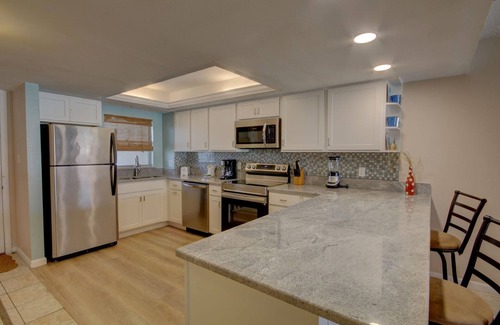 Great views from this lovely 2 BR / 2BA unit. This unit has a completely renovated, fully furnished kitchen that has everything you need to enjoy a great meal. Living room has tremendous views of the Gulf of Mexico and the large gulf front pool. All new flooring throughout the unit. There is also a great view from the master bedroom which has a king size bed. The guest bedroom has two twin size beds. Relax on your balcony while you listen to the waves hit the shore and watch dolphins swim in the Gulf of Mexico.